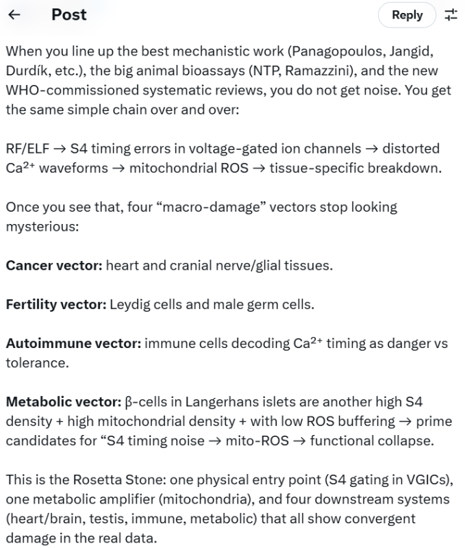 All the serious RF data are pointing at the same first domino: S4 voltage sensors in ion channels. Polarized RF/ELF adds timing noise at S4, mitochondria amplify it into oxidative stress, and the tissues with the highest S4 and mitochondrial density – heart, brain, Leydig cells, and immune cells – are exactly where we see cancer, infertility, and autoimmune-like damage in the real world.