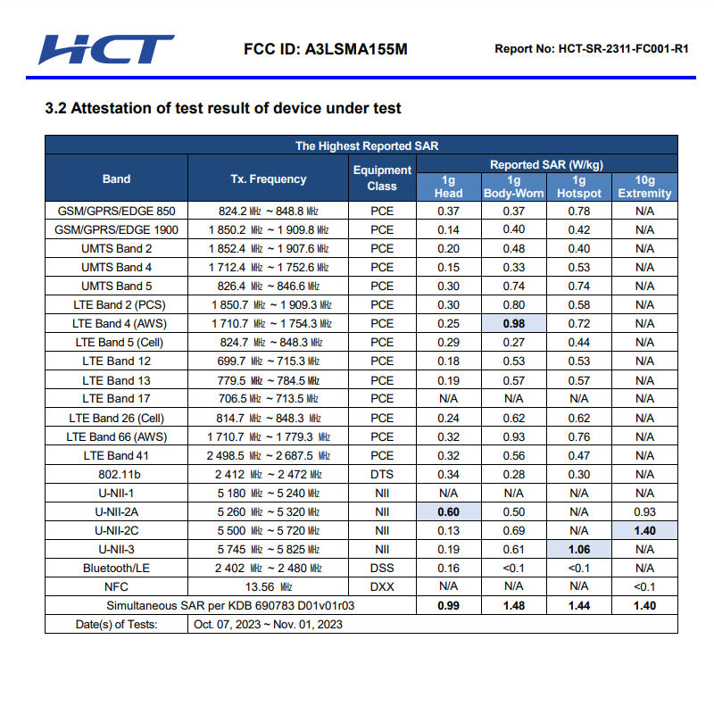 0.99 W/kg when held at the head with simultaneous cellular and Wi-Fi transmission