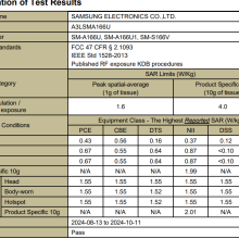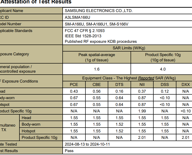 The cellular transmission SAR values for the Samsung Galaxy A16 5G (FCC ID A3LSMA166U) are 0.56 W/kg (watts per kilogram) at the head and 0.87 W/kg when worn on the body. The hotspot/Airplay SAR level is 0.87 W/kg. The simultaneous transmission SAR values for Galaxy A16 5g (cellular plus Wi-Fi) is 1.55 W/kg at the head, 1.55 W/kg when worn on the body, and 1.55 W/kg when used as a hotspot simultaneously with other transmitters active.