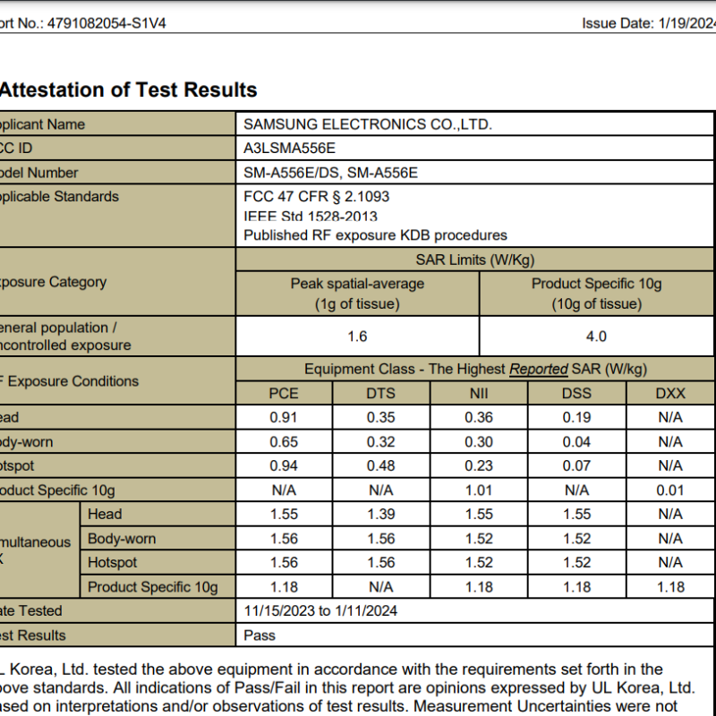 The cellular transmission SAR values for the Samsung Galaxy A55 (FCC ID A3LSMA556E) are 0.91 W/kg (watts per kilogram) at the head and 0.65 W/kg when worn on the body. The hotspot/Airplay SAR level is 0.94 W/kg. The simultaneous transmission SAR values for Galaxy A55 (cellular plus Wi-Fi) is 1.55 W/kg at the head, 1.56 W/kg when worn on the body, and 1.56 W/kg when used as a hotspot simultaneously with other transmitters active.