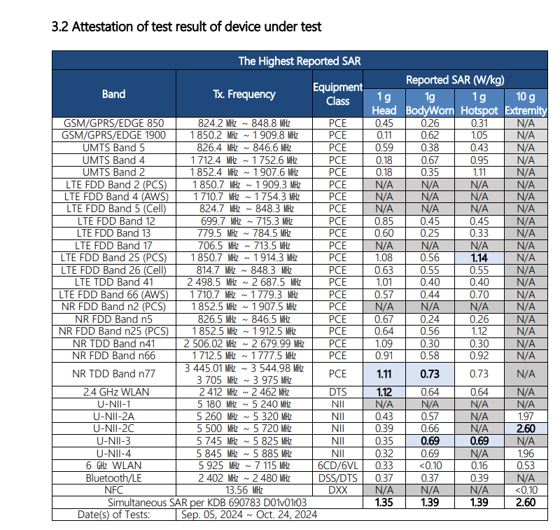 1.39 W/kg when worn on the body with simultaneous cellular and Wi-Fi transmission