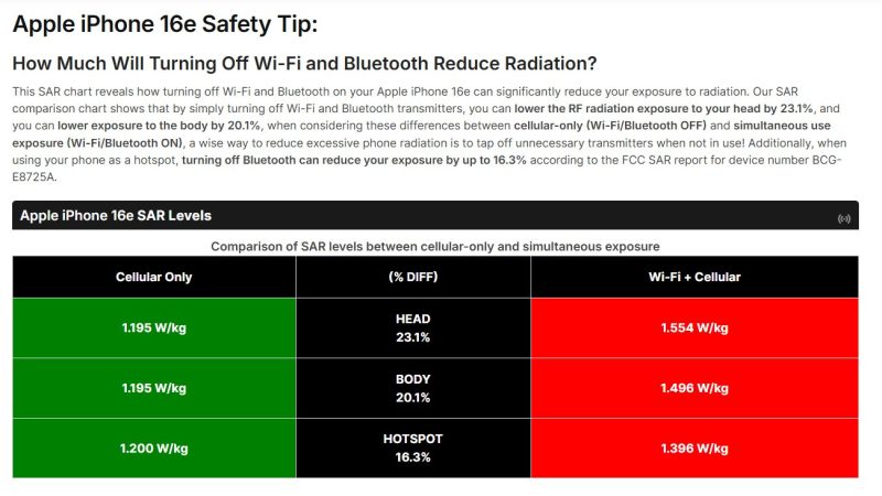 This SAR chart reveals how turning off Wi-Fi and Bluetooth on your Apple iPhone 16e can significantly reduce your exposure to radiation. Our SAR comparison chart shows that by simply turning off Wi-Fi and Bluetooth transmitters, you can lower the RF radiation exposure to your head by 23.1%, and you can lower exposure to the body by 20.1%, when considering these differences between cellular-only (Wi-Fi/Bluetooth OFF) and simultaneous use exposure (Wi-Fi/Bluetooth ON), a wise way to reduce excessive phone radiation is to tap off unnecessary transmitters when not in use! Additionally, when using your phone as a hotspot, turning off Bluetooth can reduce your exposure by up to 16.3% according to the FCC SAR report for device number BCG-E8725A.